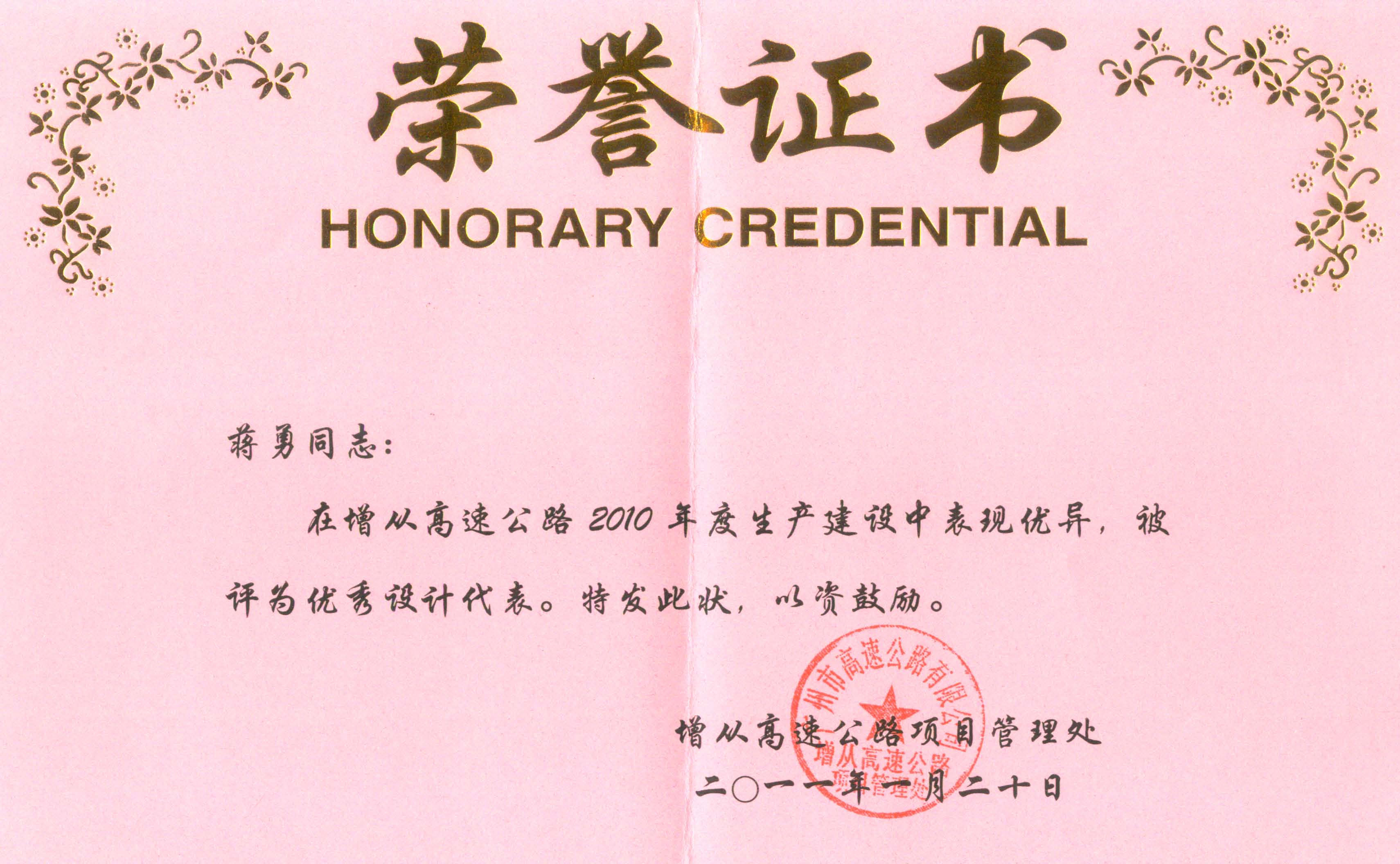 我司第四路橋設計部蔣勇同志在增從高速公路2010年度生產建設中表現優異,被廣州市高速公路有限公司增從高速公路項目管理處評為“優秀設計代表”,為公司樹立了良好的外部形象,贏得了榮譽,特此祝賀!