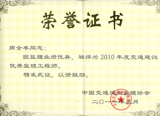 2011年5月26日,在四川召開的中國交通建設監理協會三屆二次會員代表大會上,翔飛監理公司周全豐總監受到表彰,榮獲全國“2010年度交通建設優秀監理工程師”榮譽稱號,特此祝賀!