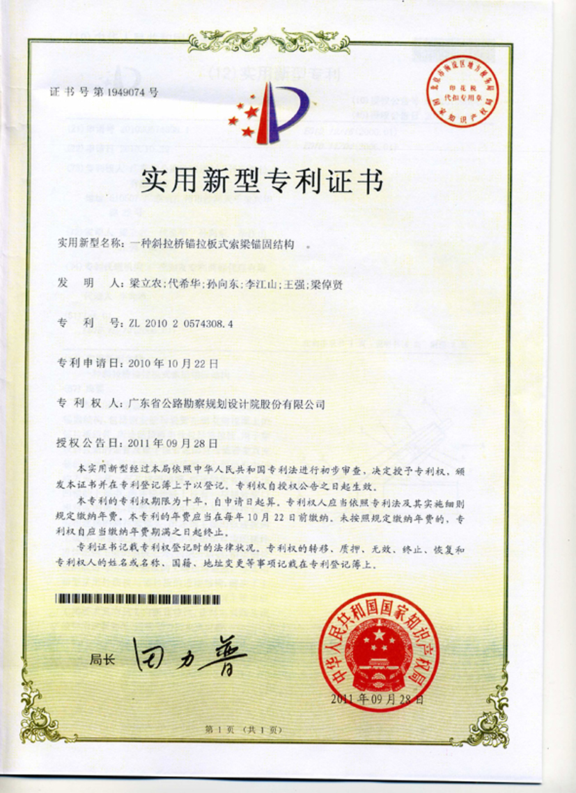 公司研發的“一種斜拉橋錨拉板式索梁錨固結構”技術,于2011年9月28日被中華人民共和國國家知識產權局授予實用新型專利權。