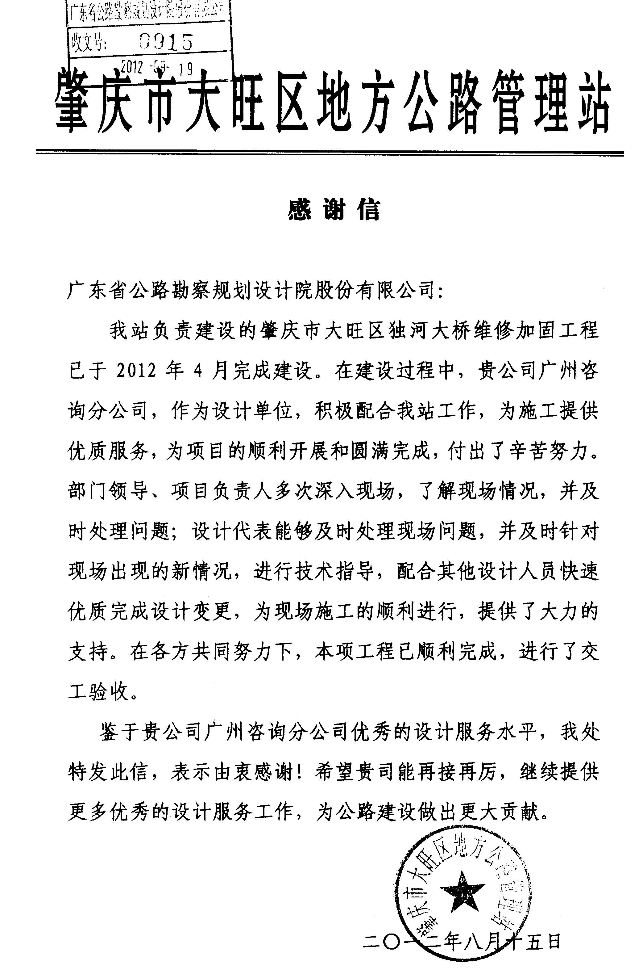 近日,肇慶市大旺區(qū)地方公路管理站發(fā)來感謝信,高度肯定我司設(shè)計后服務(wù)工作,對咨詢分公司服務(wù)團隊在獨河大橋維修加固工程設(shè)計后服務(wù)過程中表現(xiàn)出的“優(yōu)秀的設(shè)計服務(wù)水平”表示滿意和感謝。目前該項目已順利完工,進行了交工驗收。
