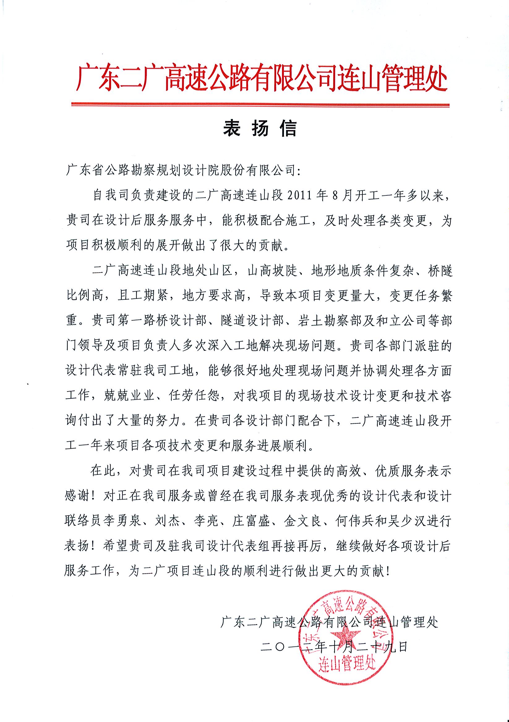 近日,廣東二廣高速公路有限公司連山管理處發來表揚信,高度肯定我司設計后服務,并對第一路橋設計部、隧道設計部、勘察分公司、和立公司等服務團隊在二廣高速連山段項目中提供的“高效、優質”的設計后服務表示滿意和感謝。同時,對擔任設計代表和聯絡員的第一路橋設計部李勇泉、劉杰、李亮,隧道設計部莊富盛,勘察分公司何偉兵,和立公司吳少漢提出表揚。特表祝賀!