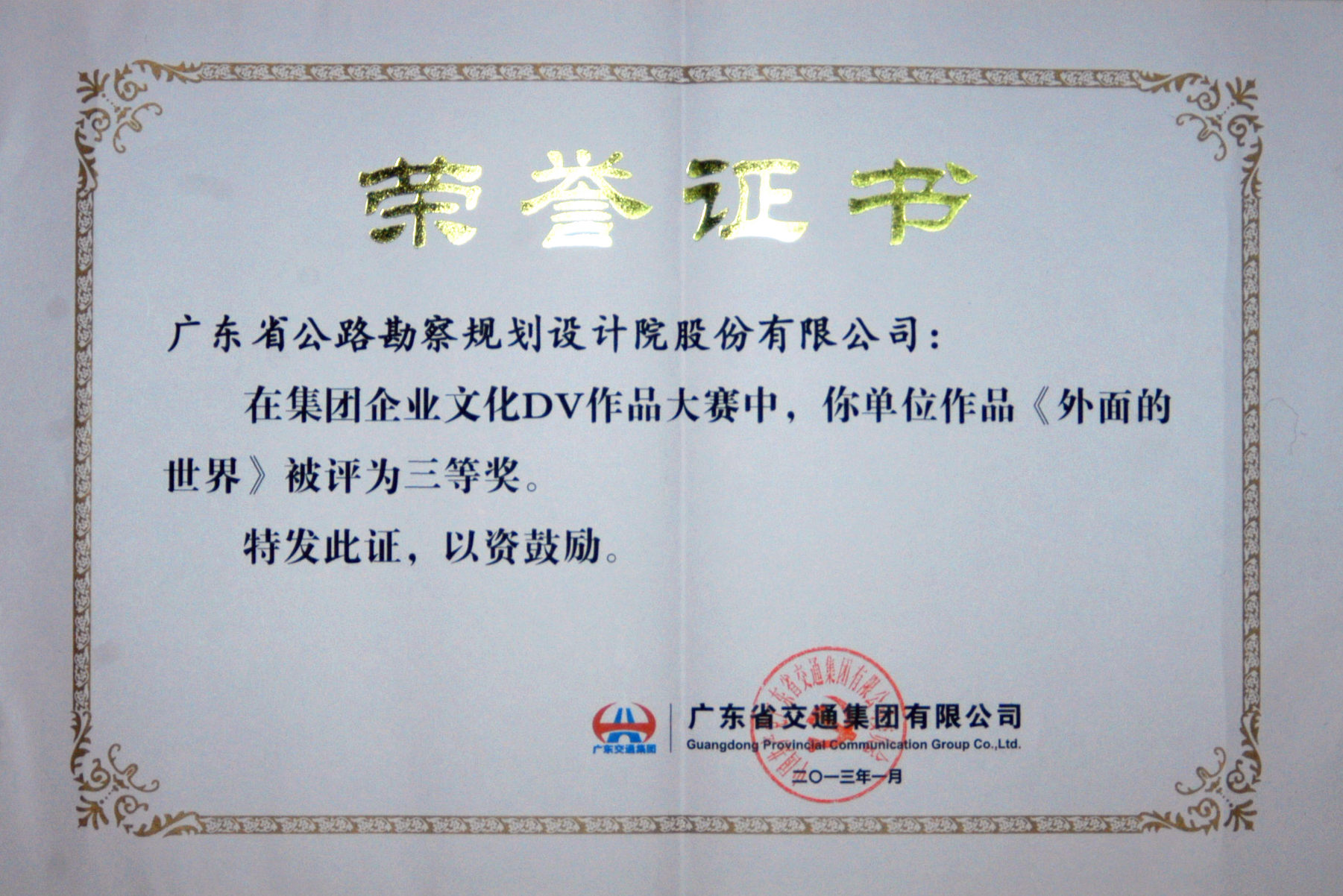 省交通集團企業(yè)文化DV作品大賽獲獎名單近日揭曉,我司共推薦了7件DV作品參選,其中,由行政事務部張安靜編輯制作的《外面的世界》在眾多優(yōu)秀作品中脫穎而出,榮獲本次比賽三等獎。