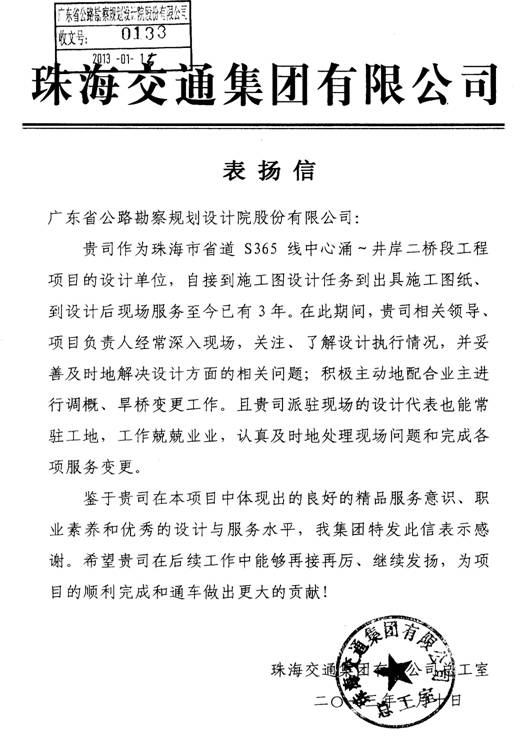 近日,珠海交通集團有限公司發專函表揚我司在省道S365線中心涌至井岸二橋段工程中提供的的技術服務,對我司的精品服務意識、員工職業素養和優秀的設計與服務水平給予了充分肯定。該項目由市政與交通工程設計部承擔。