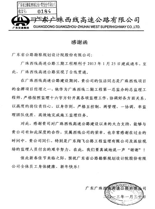 廣珠西線高速公路三期工程1月25日順利建成通車,廣東廣珠西線高速公路有限公司特發來感謝函,高度肯定我司監理服務工作,并對翔飛監理公司及該公司伍潔等派駐現場的監理人員給予通報表彰,特表祝賀。