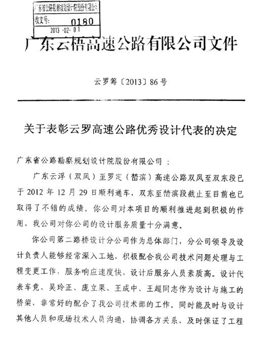 近日,廣東云梧高速公路有限公司發來表彰決定,高度肯定我司的設計服務質量,并對第二路橋分公司設計代表車競、吳玲正、龐立果、和立公司王成中和隧道部王超等人在云浮至岑溪高速公路雙鳳至榃濱段高速公路項目的設計后服務表示滿意和感謝。其中,車競和王成中被評為“優秀設計代表”,特表祝賀。