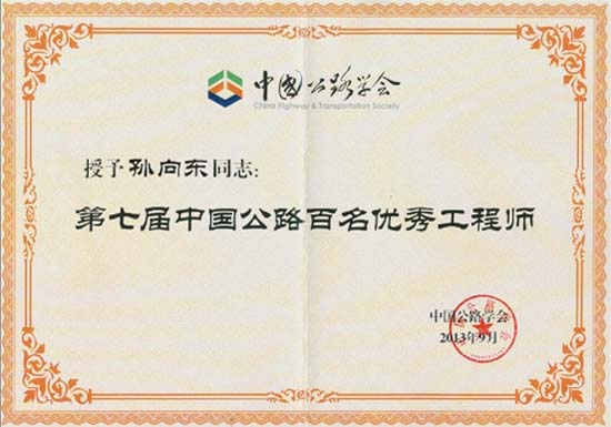 孫向東副總工程師榮獲第七屆中國公路百名優秀工程師
