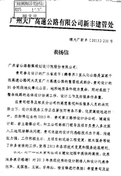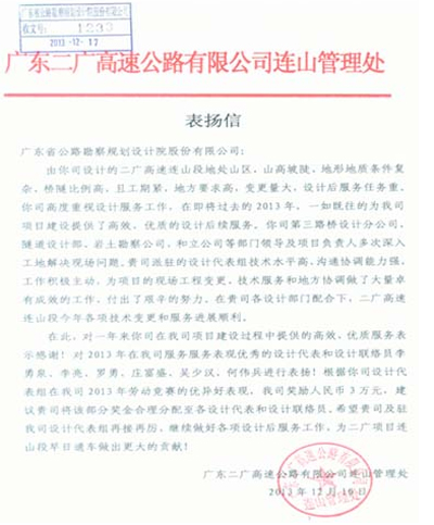 近日,廣東二廣高速公路有限公司連山管理處發(fā)來表揚信,對我司在二廣高速連山段項目中提供的高效、優(yōu)質(zhì)服務(wù)表示贊揚,同時對負(fù)責(zé)該項目的第三路橋設(shè)計分公司等組織和個人給予了通報表揚。同期發(fā)來表揚信的還有大廣高速連平至從化項目。特此報喜。