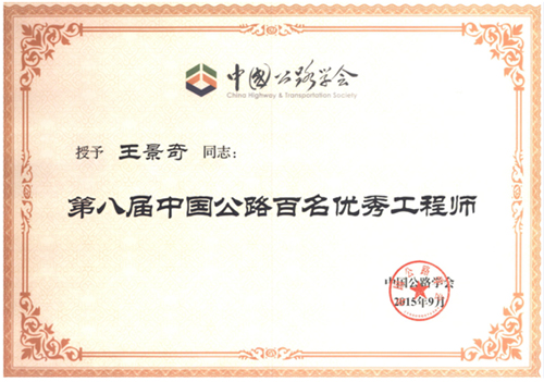 公司王景奇副總工程師近日榮獲“第八屆中國(guó)公路百名優(yōu)秀工程師”稱號(hào),并在不久前召開的2015年中國(guó)公路學(xué)會(huì)學(xué)術(shù)年會(huì)上獲得了表彰。特此祝賀!