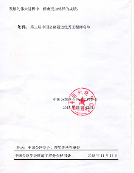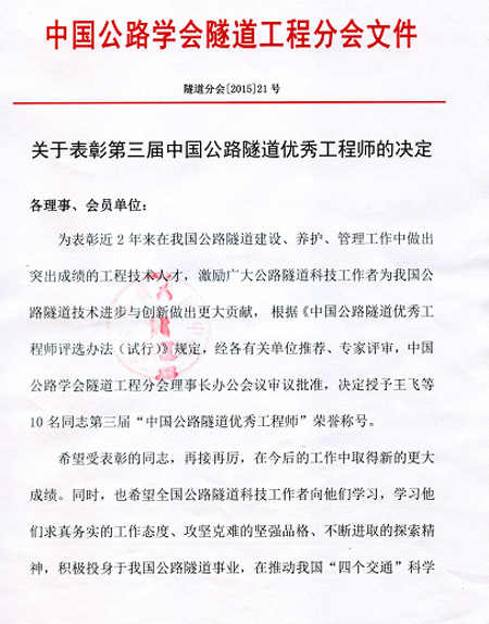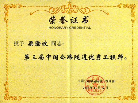 梁淦波副總工程師榮獲第三屆中國公路隧道優秀工程師稱號