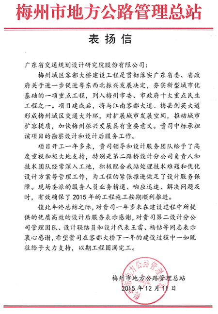 梅州城區客都大橋項目設計后服務受業主單位表彰