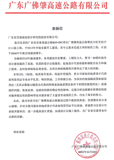 廣佛肇高速設計后服務受到業主單位表彰