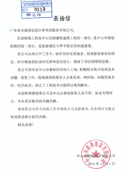 近日,中山市路橋建設(shè)有限公司發(fā)來(lái)表?yè)P(yáng)信,對(duì)我司在東部快線工程中的提供的高效、優(yōu)質(zhì)的設(shè)計(jì)后服務(wù)表示贊揚(yáng),同時(shí)該項(xiàng)目所屬的第一路橋設(shè)計(jì)分公司及設(shè)計(jì)代表呂明、張永杰等個(gè)人給予了通報(bào)表?yè)P(yáng)。特此報(bào)喜。