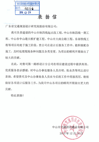 近日,中山市交通項目建設有限公司發來表揚信,對我司在中山市縱四線起點段工程、縱四線一期工程等多個工程項目中提供的高效、優質的設計后服務表示贊揚,同時該項目所屬的第一路橋設計分公司及技術人員呂明、張永杰等個人給予了通報表揚。特此報喜。