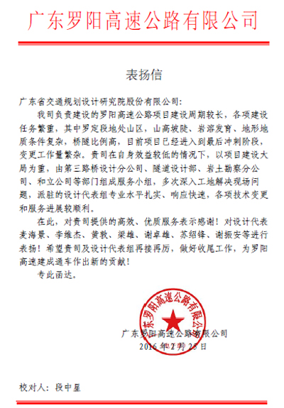 羅陽高速公路項目設計后服務受業(yè)主單位表彰