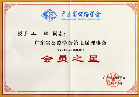 熱烈祝賀王強副總工程師榮獲廣東公路學會第七屆理事會會員之星