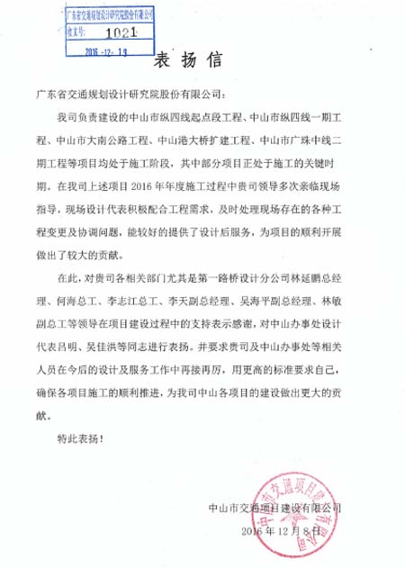 近日,中山市交通項目建設有限公司發來表揚信,對我司在中山市縱四線起點段工程、中山市縱四線一期工程、中山市大南公路工程、中山港大橋擴建工程、中山市廣珠中線二期工程等項目中提供的優質、高效、負責的設計后服務表示贊揚,同時對我司第一路橋設計分公司有關人員給予通報表揚。特此報喜!