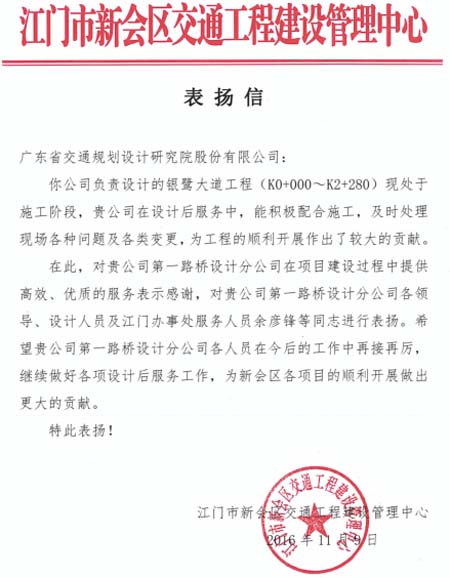 近日,江門市新會區交通工程建設管理中心發來表揚信,對我司在疏港路工程、銀鷺大道工程(K0+000~K2+280)、省道S270線新會西甲村至大洞村段路面改造工程幾個項目中提供的優質、高效的設計后服務表示贊揚,同時對負責這幾個項目的第一路橋設計分公司等組織和個人給予通報表揚。特此報喜!