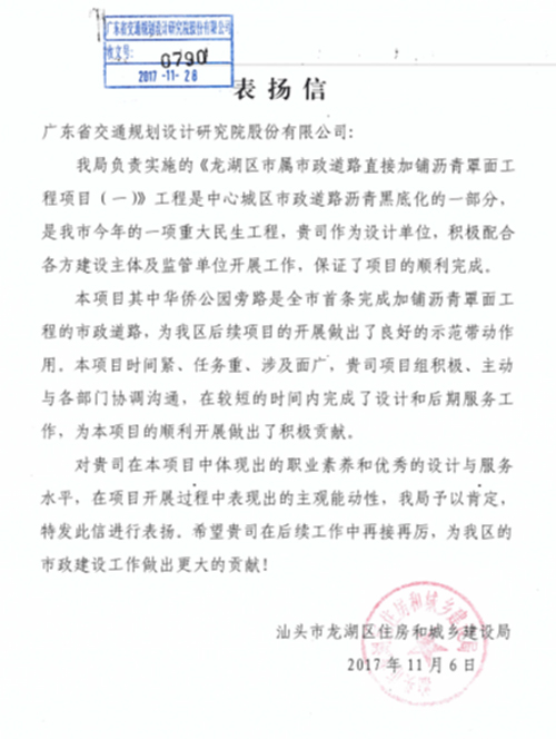 近日,汕頭市龍湖區住房和城鄉建設局發來表揚信,對我司在龍湖區市屬市政道路直接加鋪瀝青罩面工程項目(一)中提供的優質、高效的設計及后服務表示感謝,對負責此次項目的市政設計分公司及項目團隊給予了充分肯定,特此報喜!