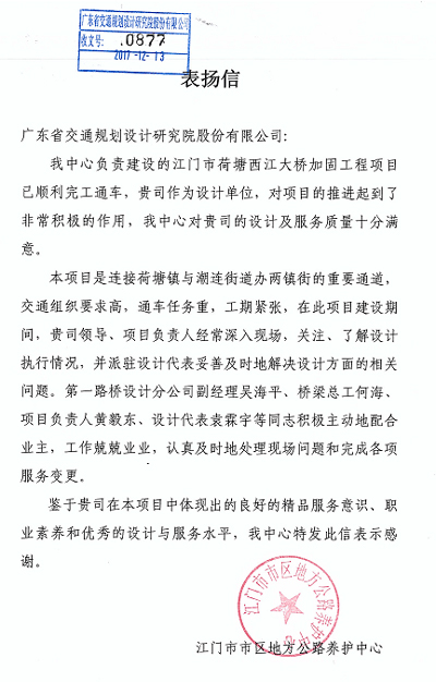 近日,江門市市區地方公路養護中心發來表揚信,對我司在江門市荷塘西江大橋加固工程項目中提供的設計及服務質量表示滿意和肯定,對負責該項目的第一路橋設計分公司及副總經理吳海平、橋梁總工何海、項目負責人黃毅東、設計代表袁霖宇給予了通報表揚,特此報喜!