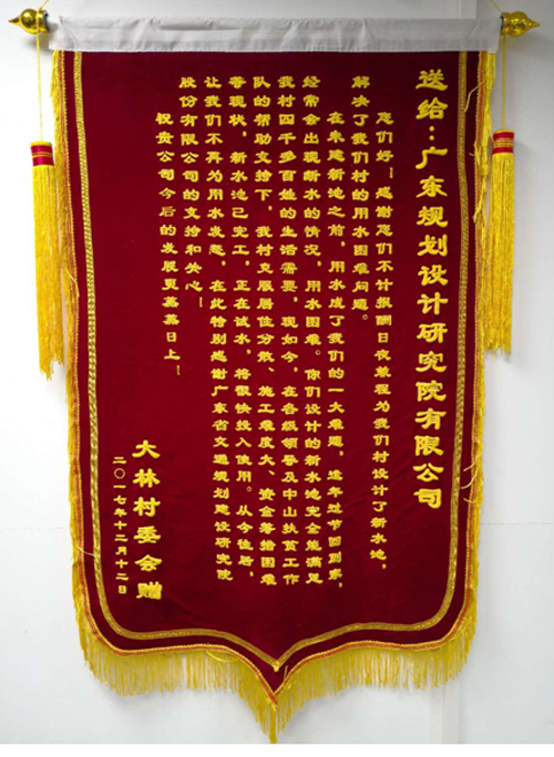 2018年新年伊始,肇慶市封開縣金裝鎮大林村委會送來了一面錦旗,對我公司市政分公司優質高效的完成大林村新水池的設計任務,為當地四千多名老百姓解決了用水難的問題表示由衷的感謝。
