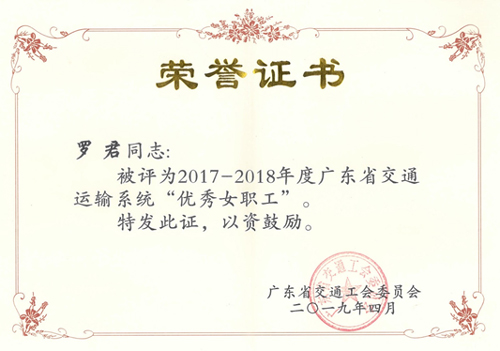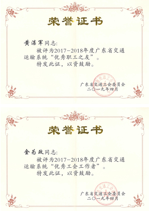 近日,我公司被廣東省交通工會(huì)評(píng)為2017-2018年度廣東省交通運(yùn)輸系統(tǒng)“先進(jìn)女職工集體”;此外,我公司黃湛軍總經(jīng)理獲評(píng)為2017-2018年度廣東省交通運(yùn)輸系統(tǒng)“優(yōu)秀職工之友”,金為政同志獲評(píng)為“優(yōu)秀工會(huì)工作者”,羅君同志獲評(píng)為“優(yōu)秀女職工”。 特此報(bào)喜!