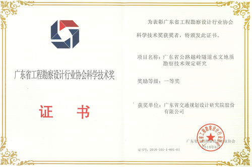 《廣東省公路越嶺隧道水文地質(zhì)勘察技術(shù)規(guī)定研究》榮獲一等獎(jiǎng),獲獎(jiǎng)人員:李水清、李紅中、張修杰、王軍、王強(qiáng)、鄧超文、李樹(shù)茂、張金平、林少忠、劉祥興;