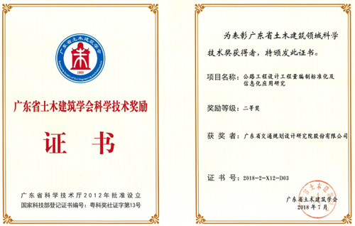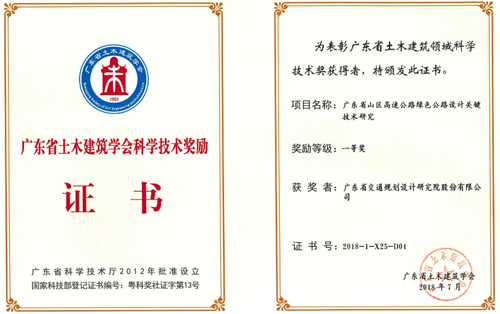 《廣東省山區(qū)高速公路綠色公路設(shè)計(jì)關(guān)鍵技術(shù)研究》榮獲一等獎(jiǎng),獲獎(jiǎng)人員:彭向榮、黃湛軍、梁立農(nóng)、陳新富、陳競(jìng)飛、梁志勇、李國(guó)安、溫玉輝、萬(wàn)志勇、羅旭東、王強(qiáng)、孫向東;